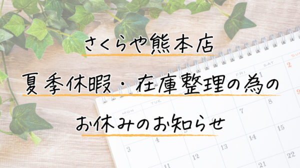 今年もたくさんのご来店・お問い合わせありがとうございます。 『さくらや熊本店から年末年始休業のお知らせです』 **************************** 令和6年12月23日(月)~ 令和7年 […]